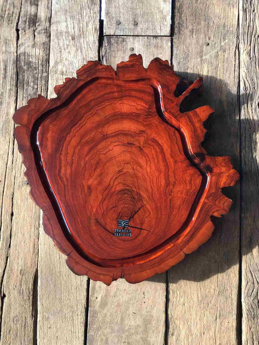 Tábua de Churrasco em madeira de Peroba Rosa. A peça é dupla face, ou seja, um lado possui canaleta resinada para coletar os sucos dos cortes de churrasco e o outro lado não possui canaletas, portanto, pode ser usado para montagem de tábua de frios, queijos e petiscos.